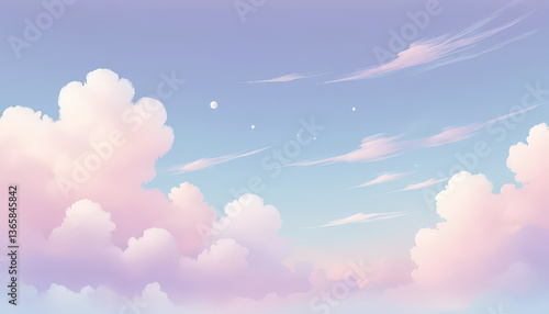 serene sky filled with soft, fluffy clouds in shades of pink and white, gently illuminated by warm light. tranquil atmosphere evokes sense of peace and calmness
