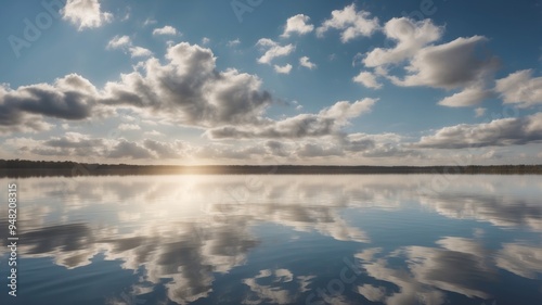 Serene sky with fluffy clouds reflected on calm water.