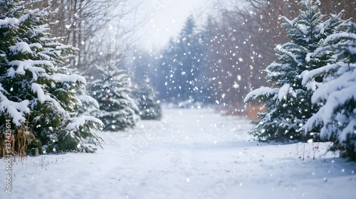 Serene Snowy Christmas Tree Farm Landscape with Holiday Charm A picturesque winter wonderland scene with a Christmas tree farm in the distance