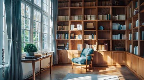 Serene Study Room with Inviting Empty Bookshelf Awaiting Literary Treasures