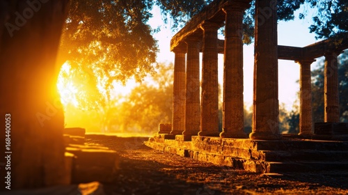 Serene sunrise illuminating ancient stone pillars in a tranquil landscape with lush trees nearby