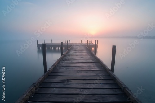 Serene Sunrise Misty Lake Wooden Jetty Calm Water ai generated