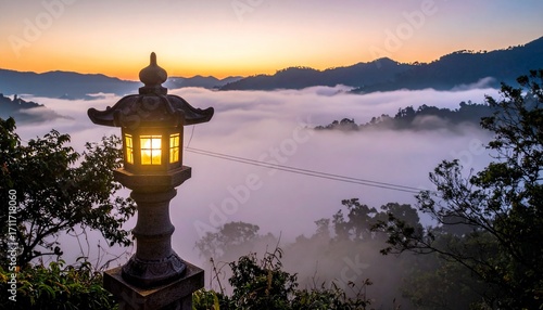Serene Sunrise: Mountaintop Lantern Illuminates Misty Valley