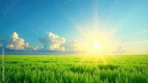 Serene Sunrise Over a Verdant Meadow, Peaceful Pastoral Landscape with Golden Hour Light and Fluffy Clouds