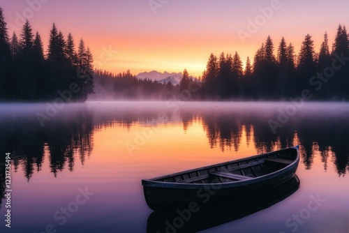 Serene Sunrise Over Calm Lake with a Small Boat and Misty Forest