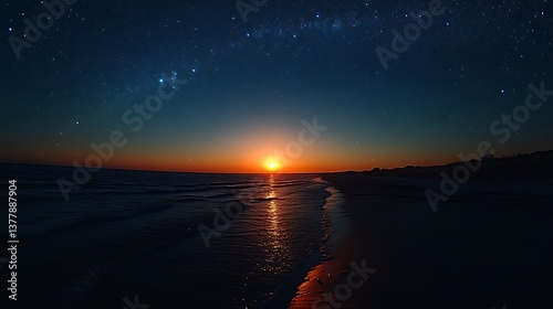 Serene Sunset Over Ocean Beach Under Starry Sky