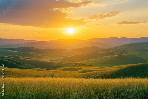 Serene Sunset Over Rolling Hills in Expansive Landscape