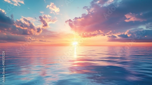 Serene sunset over the ocean with sun rays featuring a 3D rendered illustration of tranquil waters and vibrant colors