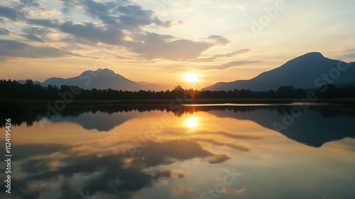 Serene Sunset Reflection on Alaskan Lake: Golden Hour Photography. AI Generated
