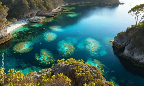 serene tropical bay with crystal clear turquoise waters, surrounded by lush green vegetation and rocky