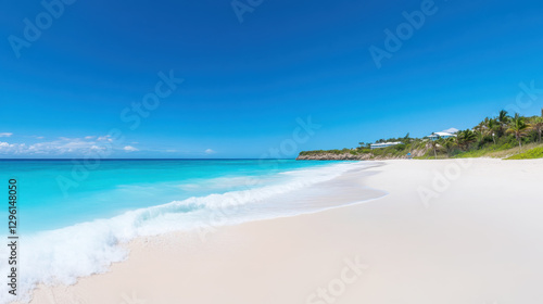 Serene tropical beach with clear blue waters and white sand under a sunny sky