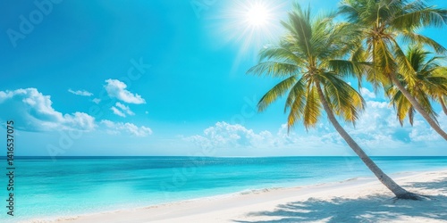 Serene Tropical Beach with Palm Trees Under Clear Blue Sky and Vibrant Sunlight Reflecting on Tranquil Ocean Water Surface