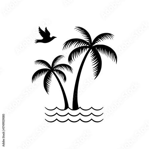 Serene tropical paradise with palm trees swaying and a bird soaring over gentle ocean waves