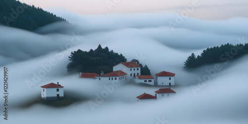 Serene village nestled in a sea of fog, white houses with red roofs peeking through the mist-covered hills. A breathtaking, tranquil scene.