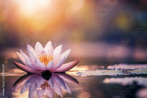 Serene Water Lily Blooming in Tranquil Pond at Sunset Light