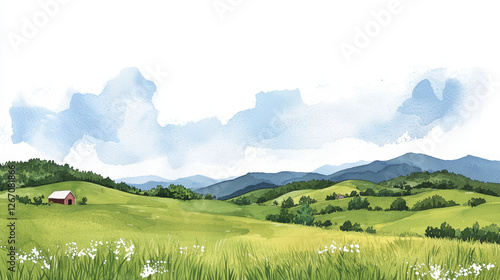 serene watercolor landscape featuring rolling green hills, distant mountains, and small red barn. sky is filled with soft clouds, creating