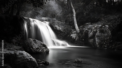 Serene Waterfall: Monochromatic Nature Photography