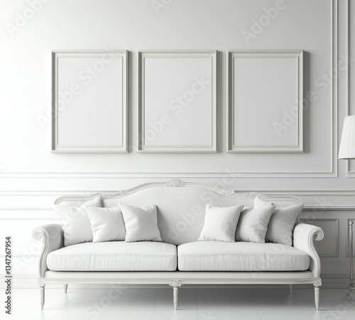 Serene White Living Room Interior with Ornate Sofa and Empty Frames