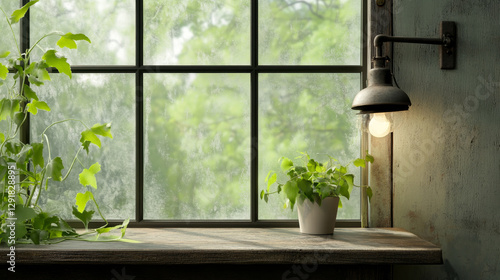 Serene Windowsill Plants and Light - Two potted plants sit on a rustic windowsill, bathed in soft light from a vintage wall lamp. Green leaves and a tranquil outdoor view