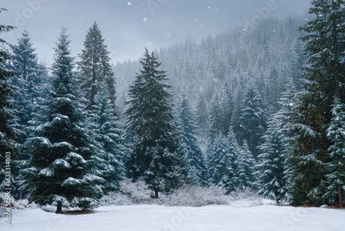 Serene winter forest scene with falling snow blanketing evergreen trees and a frosted landscape