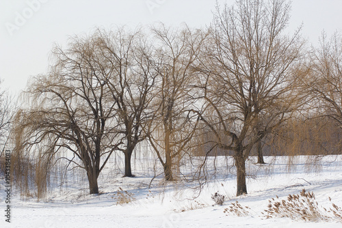 Serene Winter Scene Featuring Bare Willow Trees Standing Against a Snowy Landscape