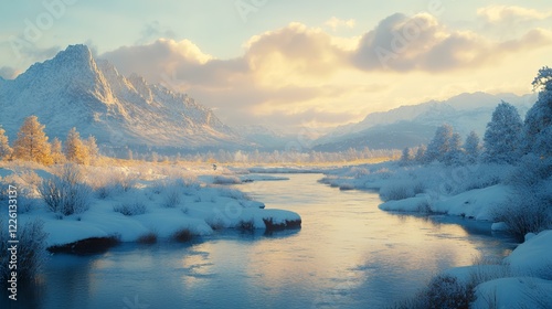 Serene winter sunrise over snow-covered mountains and river valley; idyllic nature scene for travel brochures
