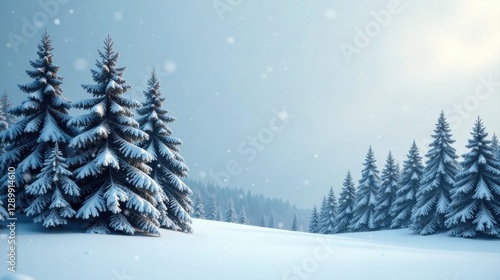 Serene Winter Wonderland Snow-Covered Evergreen Trees on a Gently Rolling Hill Under a Light Snowfall