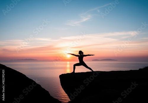Serene woman in yoga warrior pose on a cliff edge at breathtaking sunrise