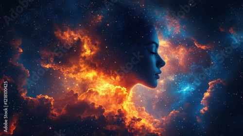 Serene woman's profile silhouetted against a cosmic nebula of fiery orange and deep blue hues.