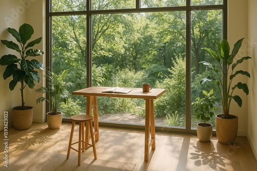 Serene Workspace with Simple Desk and Lush Greenery View