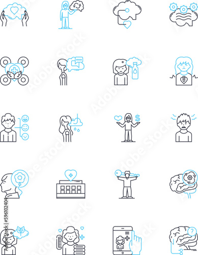Serenity and peacefulness linear icons set. Tranquility, Serenity, Calmness, Stillness, Harmony, Quietude, Relaxation line vector and concept signs. Equanimity,Contentment,Bliss outline illustrations