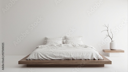 Serenity in a Japandi bedroom wooden bed linen sheets ceramic vase on a floating nightstand minimalist bliss