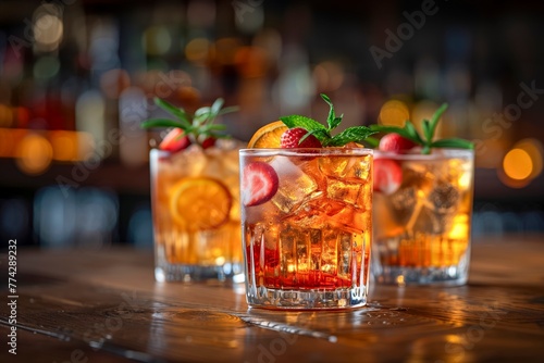 Series of iced cocktails in hues of sunset, delicately garnished, are elegantly presented on a bar counter, capturing the intimate ambiance of a relaxed evening gathering.