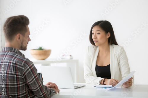 Serious asian businesswoman executive scolding employee holding document report dissatisfied with work results, skeptical unconvinced chinese hr manager asking questions about cv at bad job interview