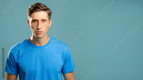 Serious man portrait. Masculine power. Successful achievement. Young attractive focused guy in t-shirt looking at camera isolated on blue copy space.