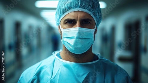 Serious medical professional wearing surgical scrubs, cap, and protective face mask in a hospital corridor