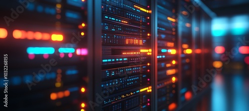 Servers in data center room with blue and orange lights, modern server room, Big data, Server farm.