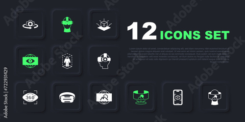 Set 3d modeling, Virtual reality glasses, 360 degree view, Big brother electronic eye, and Wide angle picture icon. Vector
