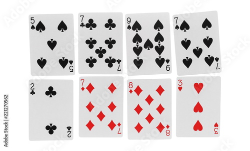 Set and collection of playing cards for poker and gambling, isolated on white background with clipping path