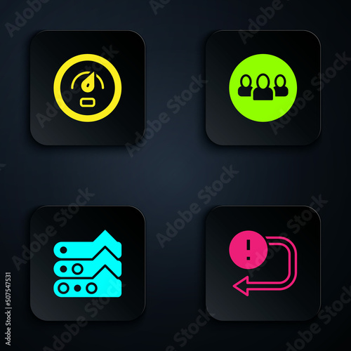 Set Arrow, Digital speed meter, Graph, chart, diagram and Project team base. Black square button. Vector