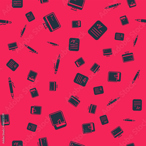 Set Book, Computer monitor, Pen and Exam sheet with A plus grade on seamless pattern. Vector