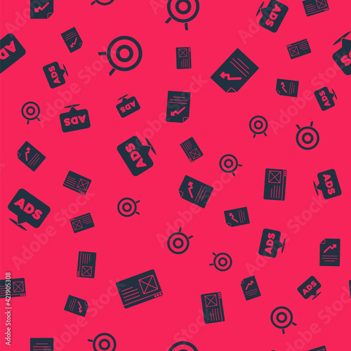 Set Browser window, Target sport, Advertising and Document with graph chart on seamless pattern. Vector
