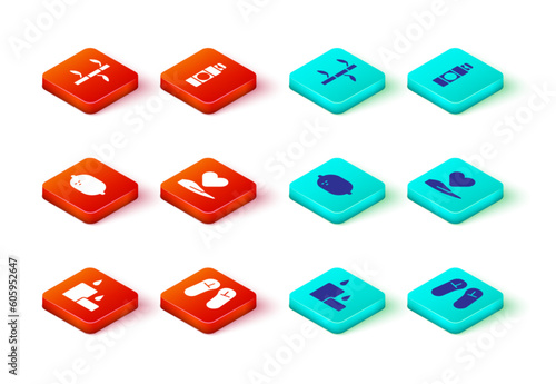 Set Burning candle, Slipper, Lemon, Heart hand, Cream or lotion cosmetic tube and Bamboo stems with leaves icon. Vector