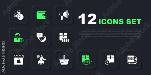Set Carton cardboard box, Free delivery service, Telephone 24 hours support, Cardboard with free symbol, Buyer, Auction hammer, Wallet and Shopping basket icon. Vector