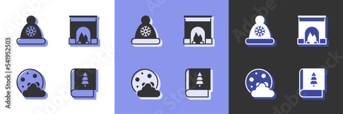 Set Christmas book, Santa Claus hat, night and Interior fireplace icon. Vector