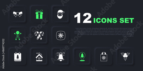 Set Christmas shopping bag, Branch viburnum, Candy cane with stripes, tree, Holiday gingerbread man cookie, Merry house, Gift box and ringing bell icon. Vector
