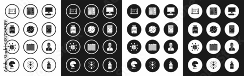 Set Computer monitor with keyboard and mouse, Planet, Medicine bottle pills, Pendulum, Book, Notebook, Assistant and Bacteria icon. Vector