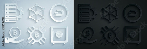 Set CPU mining farm, Cryptocurrency coin Dash, Hand holding Bitcoin, Safe, Blockchain technology and Server gear icon. Vector