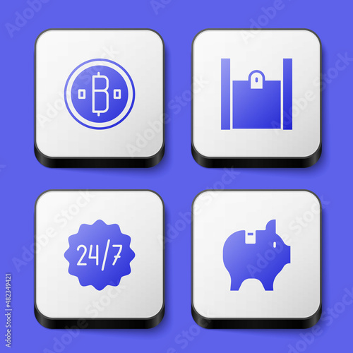 Set Cryptocurrency coin Bitcoin, Paper shopping bag, Clock 24 hours and Piggy bank icon. White square button. Vector