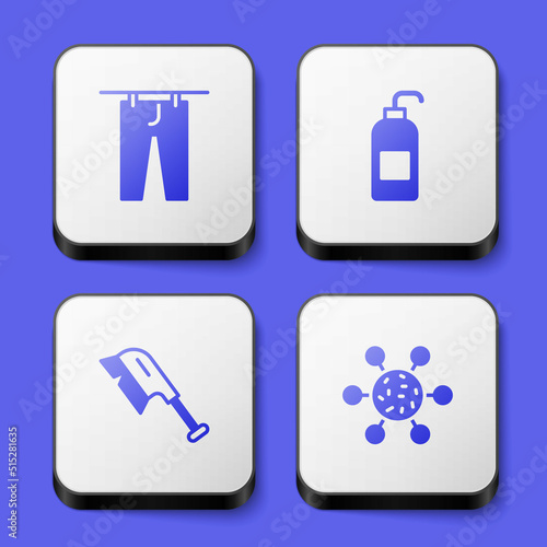 Set Drying clothes, Antibacterial soap, Brush for cleaning and Bacteria icon. White square button. Vector